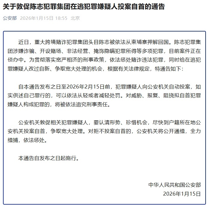 1月15日,公安部发布关于敦促陈志犯罪集团在逃犯罪嫌疑人投案自首的通告: