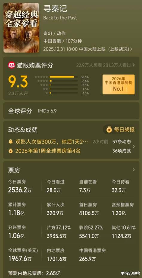 眼下《寻秦记》的豆瓣开分6.5分,预测票房也只有2.65亿,至少9亿才能回本的票房望尘莫及。