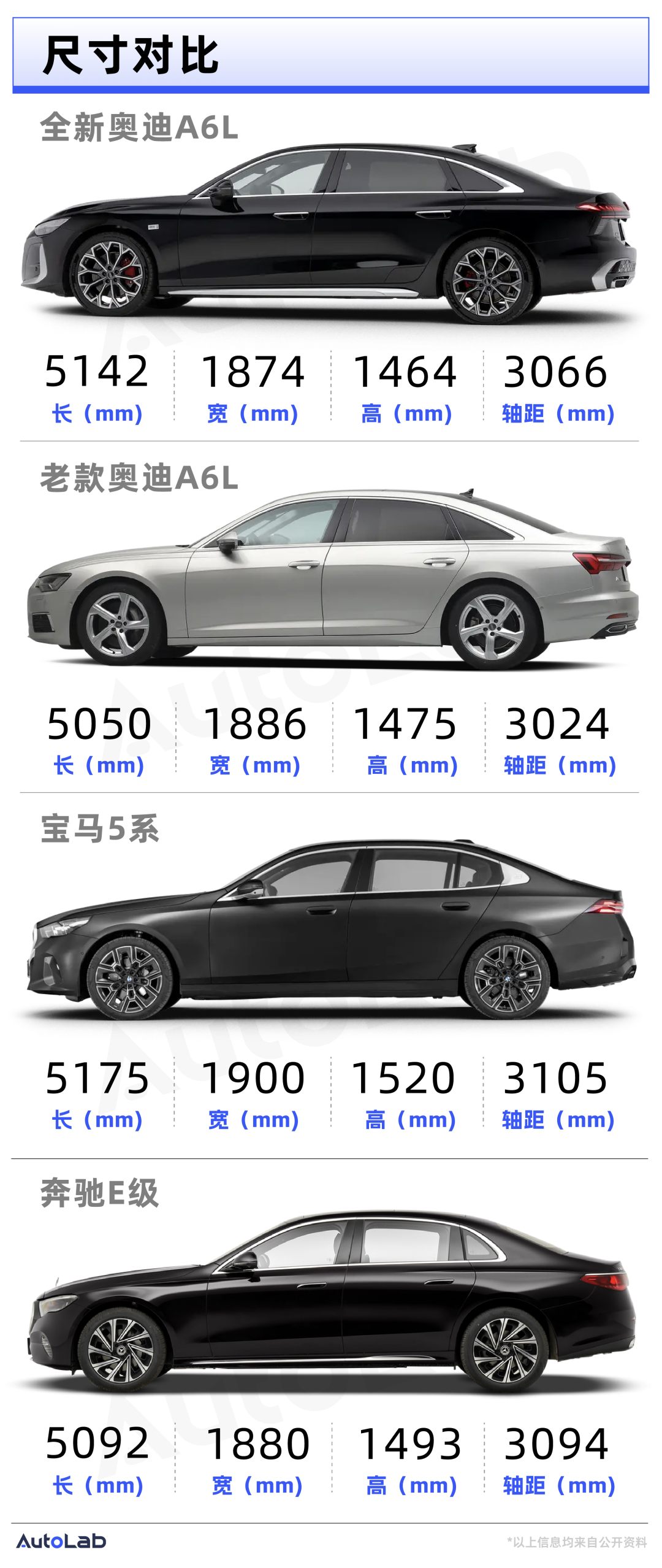 在尺寸方面,全新A6L同样进行了大幅的加长。长宽高为5142/1874/1464mm,轴距为3066mm,对比老款车型来说车长方面增加了近100mm,轴距也增加了42mm。