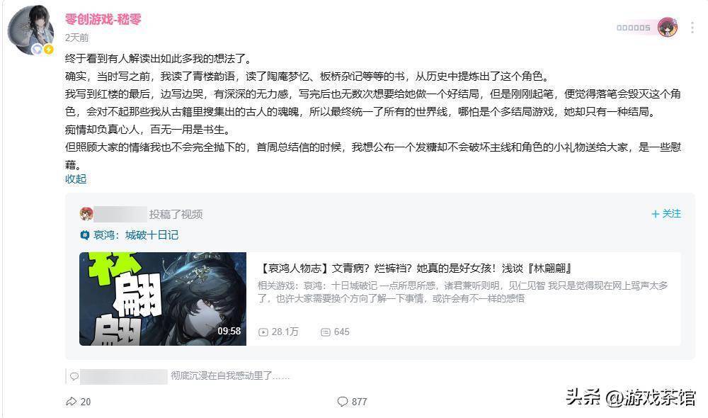 嵇零:我觉得达到了。只是现在才过去几天,很多人还停留在玩下半身梗的阶段。随着时间推移,会有越来越多的人做到真正进入这个角色。我也很难说以后还能不能在文学性上做得比《哀鸿》更好,可能至少还得积累几年,才能再做出这样大的戏剧性反差。在看惯了我作品的玩家眼里,他们接下来四五年可能会觉得我江郎才尽了。因为像《哀鸿》这种作品我很难再突然做好一次。